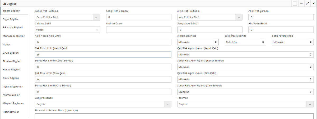 Finansal İstihbarat Notu (Uyarı İçin): Firmanın finansal olarak yaptığı işlemlerde uyarılabilmesi adına girilen bilgi notlarıdır. Ticari bilgiler alanına gelinerek “Finansal İstihbarat Notu” kısmına verilmek istenen mesaj yazılır.