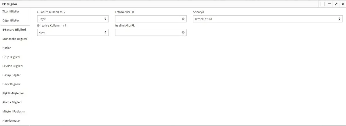 Bu alanın Hayır seçili gelmesi durumunda, Fatura/İrsaliye Alıcı Pk alanları boş gelir.