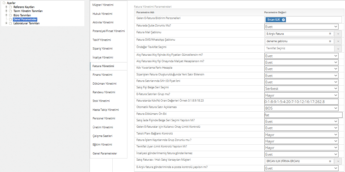Ayarlar – Büro Tanımları – Genel Parametreler – Fatura Yönetimi seçilir.